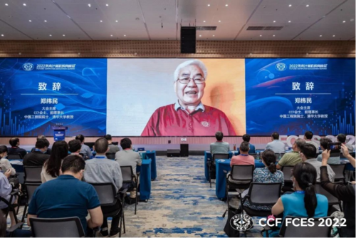 22日上午8:30,峰会准时开幕,由大会程序委员会主席,CCF教育工委主任,上海交通大学教授臧斌宇主持大会开幕式。大会主席郑纬民教授线上致辞,他表示,FCES是国内最高端的教育峰会,今年选择在最新落成的CCF业务总部和学术交流中心召开非常有意义,超过60位专家共聚讨论,大会规模大、水平高,他介绍了大会围绕讨论的6个方向:第一,在课程体系建设方面,我们该如何构建高水平基础课程体系,进一步提升教师的教学水平?第二,在学生创新能力培养方面,我们该如何开展高水平本科拔尖人才培养?第三,在学生工程能力培养方面,我们该如何发挥学校与企业两方面的力量,来培养学生坚实的工程能力,突破卡脖子技术?第四,在国际化办学方面,我们该如何在新环境下走好国际化办学的道路?第五,在评价体系方面,我们该如何构建有利于科技自立自强的评价体系?第六,在多学科交叉方面,我们该如何抓住新的发展机遇、找到新的发展支撑?他还在致辞中对苏州市政府、企业赞助商及讲者对大会的支持表达了感谢。