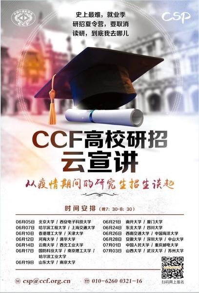 CCF以CSP认证合作校为主,开展线上研招云宣讲活动,29所高校负责研究生招生的主管老师,将在6月5日-7月3日期间,介绍本校2021年研究生招生计划,通过腾讯会议、B站直播和爱奇艺直播,帮助以CCF学生会员为主的广大计算机学子提前做好考研准备。